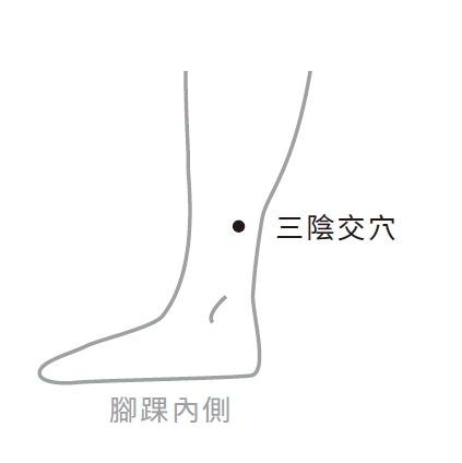 內踝尖直上三寸,位於脛骨的後緣。取穴方法是正坐屈膝成直角,在踝關節內側,足內踝上緣四指寬,在踝尖正上方脛骨邊緣凹陷處。 |
