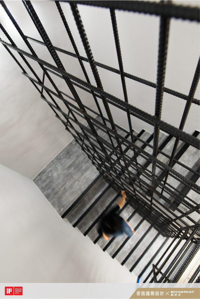為保有原始結構,空間形態順應結構而生。透過鐵件的變化性與延展性,給予空間最適宜的空間表情。裸露的鋼筋強化了樓梯的支撐力,成為業主收藏品的展示牆。而破碎的紅磚牆,裸露在空氣中,形成新舊視覺切換的媒介。