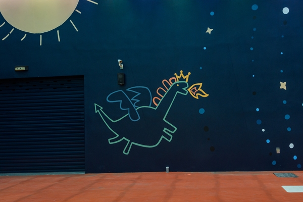 北側則是借鏡嘉義北回歸線,將牆面化身神秘星空,讓人彷佛遨遊於外太空,遇見一隻噴火龍超古錐!「親子館」全新彩繪牆適合入鏡,尤其當小朋友騎著電動車繞行寬敞又安全的專屬兒童電動車道時,不僅帶給旅客拍出精彩的打卡美照,更讓親子之間留下獨樹一格、難忘的旅遊回憶。