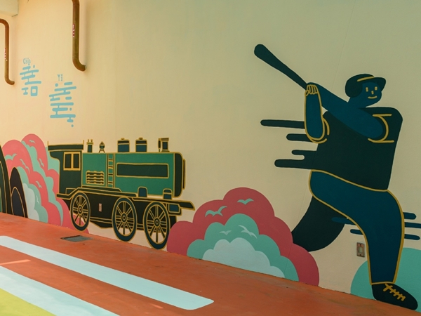 館內東西兩側牆面彩繪以介紹嘉義特色為主,可以看到阿里山、茶園、小火車、櫻花,廟宇牌樓與高跟鞋教堂,以及著名的Kano棒球選手英姿等繪圖。西側充滿粉嫩色系,粉卡通版的山林風貌,猴子成為駕駛員,臺灣黑熊頭鷹是飛行員,還有小鹿、貓兒來作伴。