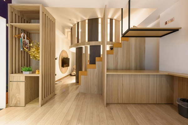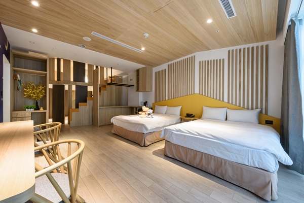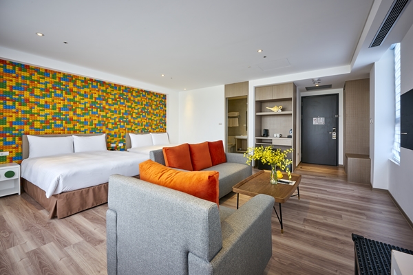 「積木館」為金級環保旅館,共有188間客房,不提供一次消耗性備品,有雙人、三人房和家庭四人房,簡約設計風格,床頭立面飾以繽紛色系的積木圖案及積木拼成的小熱氣球,而去年為了商務人士,部分一大床房內進行改裝,增設標準書桌,以利電腦作業,非常貼心。另外廊道間展出百件以世界名畫為題材所拼貼的積木掛畫,館內3F設有近百坪的發光積木遊戲室,巨型發光積木牆,各式變化發光積木,讓大家揮灑創意、盡情拚個過癮。
