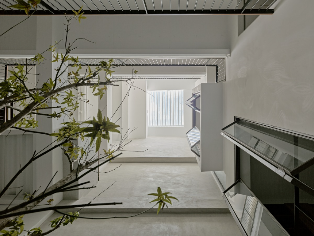 並於天井下方一樓處植入樹木綠意,一旁的灰泥花台連接著階梯,打造隨處可坐下的空間,圍塑出如廣場般的自在輕鬆,使居者身處室內仍有和戶外、自然互動的感受,該處更成為家中的核心場域;同時,將屋主需要的生活空間,如書房、視聽室、健身房、遊戲室等場所與中央天井連接,並將其中一扇面對天井的室內窗,設置成陽台坐榻增進與廣場交流和視覺上的趣味性,讓家人處於各自獨立的場域裡,也能保有緊密的互動。