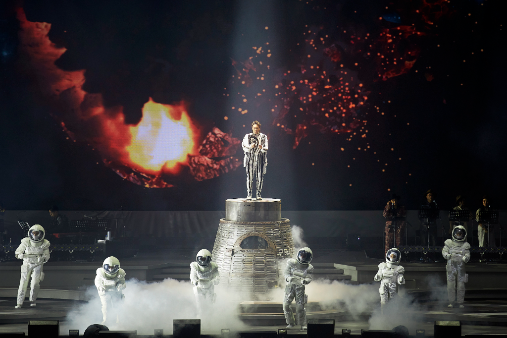 這次把巨型屏幕帶到各地演出,以及5套主題式服裝,其中有3套是在台北站初登場,帶給觀眾視覺、聽覺上的震撼與享受!今晚(7/15)首場開演,以Eason睡在床上的巨幕影像揭序,點題「Fear and Dreams」,四周和身上滿佈各種爬蟲,之後他跌進深淵,畫面一轉飛進太空,此時響起熟悉的〈2001 太空漫遊〉主旋律,穿上太空人裝的 Eason,從舞台中央的太空船,跟一群太空人舞者一同登場。當地球面臨崩滅,一群禿鷹怪鳥隨著〈人神鬥〉出現,大屏幕上的洪水浪濤、漫天烏煙瘴氣、戰爭爆炸場面十分震撼。其後在一片荒涼中,小女孩送上手執的白花,全場為之動容,〈當這地球沒有花〉也帶給大家喘息與反思的空間;之後一連串演唱〈謊言〉、〈時代巨輪〉,扮成說謊的大頭木偶公仔、帶著古代黑死病面罩化身的舞者現身於舞台上,呼應我們身處時代巨輪之中,無人能逃脫的悲歌,影像、舞蹈,加上精心編選的歌曲別具意涵,除了聽覺與視覺多重感官懾人,演唱會的破題更帶來思考,訊息量滿溢;最後以平靜的大海,伴著〈想聽〉為第一部份作結。