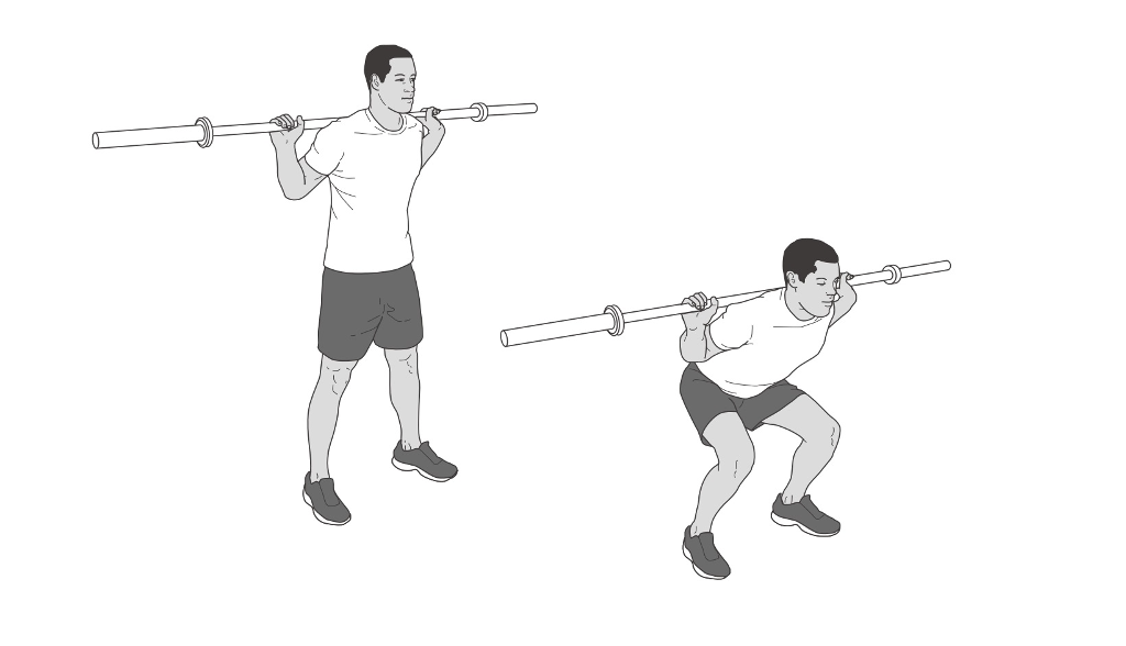 2、站在深蹲架前面,在約肩膀高度的地方放一根奧林匹克舉重健身槓。