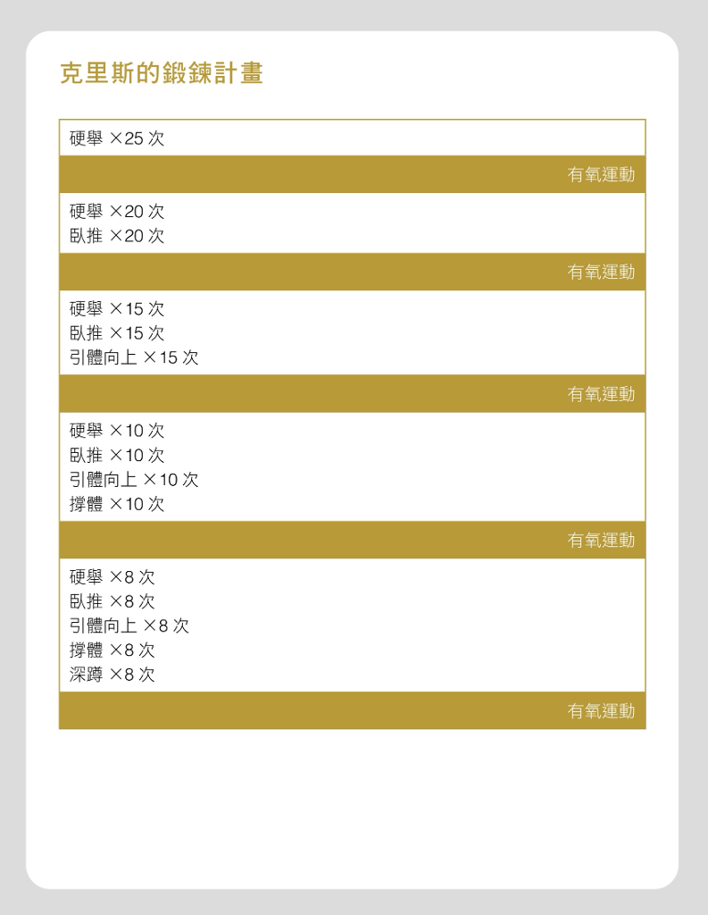 本文摘自采實文化:好萊塢頂尖教練的5-2鍛鍊計畫:5種鍛鍊動作✕2分鐘有氧,打造好萊塢巨星絕佳體態&體能的超強訓練法【附5支西門教練解說影片】