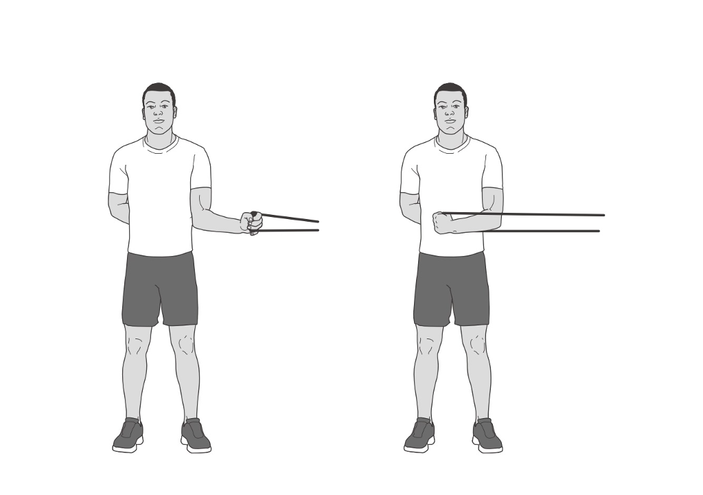 2 保持手肘緊貼身體一側,旋轉手臂,使其遠離你,直到你感覺阻力帶有一些張力。