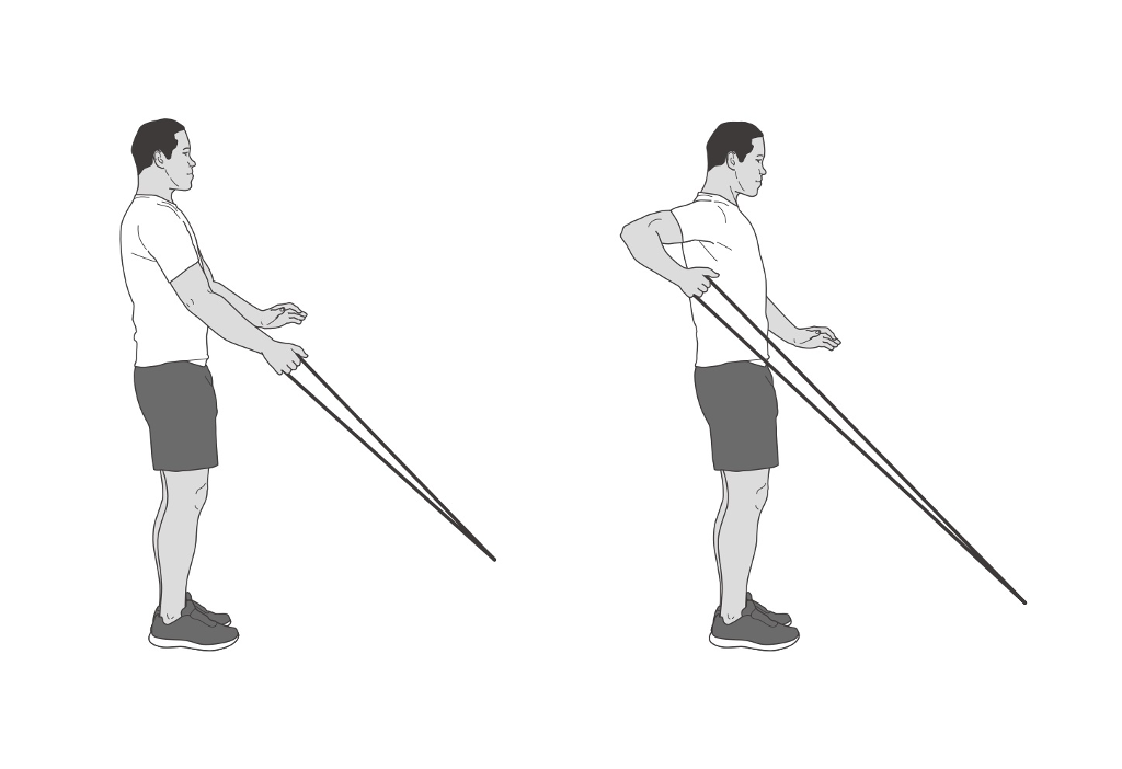 2 讓手肘緊靠身體,同時把阻力往後拉,直到手來到胸部高度。這樣可以讓你收緊背闊肌,也就是你背部的側面肌肉。