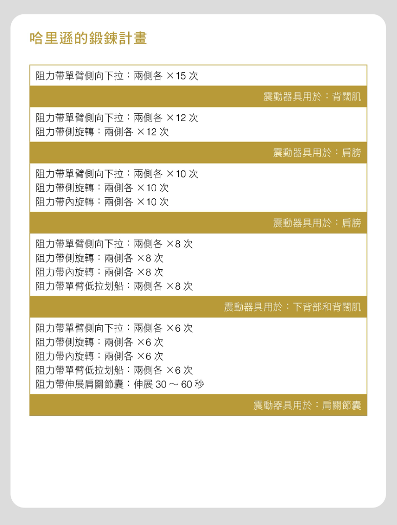 印第安納.瓊斯使用的鞭子相當沉重,哈里遜必須表現出一個特定動作,使鞭子劈啪作響。當然,他在前四部印第安納.瓊斯電影中已經成功甩過鞭子,但是我設計的計畫能夠使他的身體自然行動,並且提供他在這部新電影中需要的流暢度與靈活度。此外,很重要的是這個計畫也提供他感覺良好的因子,而且他不會感受到疼痛。2021 年,拍攝印第安納.瓊斯的同時,哈里遜每週進行此鍛鍊兩次。這個計畫我推薦給所有年齡層的讀者,因為它能夠使你的身體保持行動,也讓你的心智一同參與。此計畫可以讓身體聰明地鍛鍊,原因是你能讓身體在不會疼痛的情況下自然地動作,同時有助於預防痠痛,這就是我一直強調的「智能健身」。