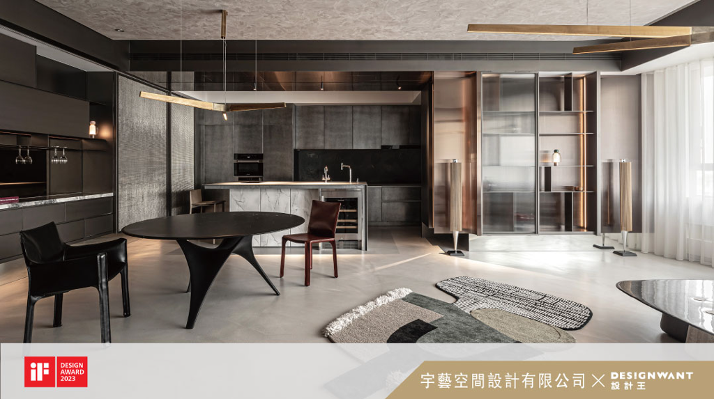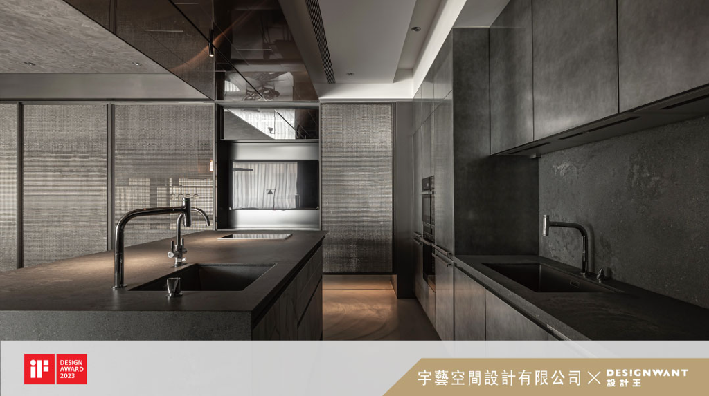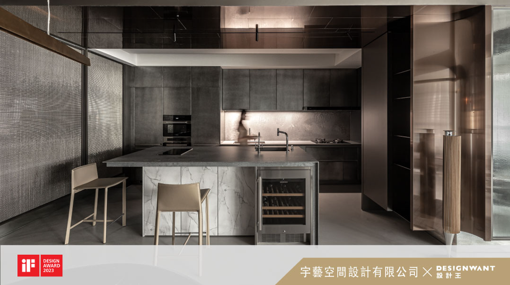 「在冷冽的金屬中探討時間的意義,在空間與空間之間打破傳統的 框架。」 環境中擁有大量的金屬材質,玄關一進去,金屬編織網跟廚房櫃體的金屬材質結合,達到光線連結,讓視覺有延伸的效果,金屬立面的對向是自然窗景,自然光映射在網片上,漫射出金屬特有的質感, 在亮點處用以暖光點綴,讓收納櫃體也能成為藝術品之一。