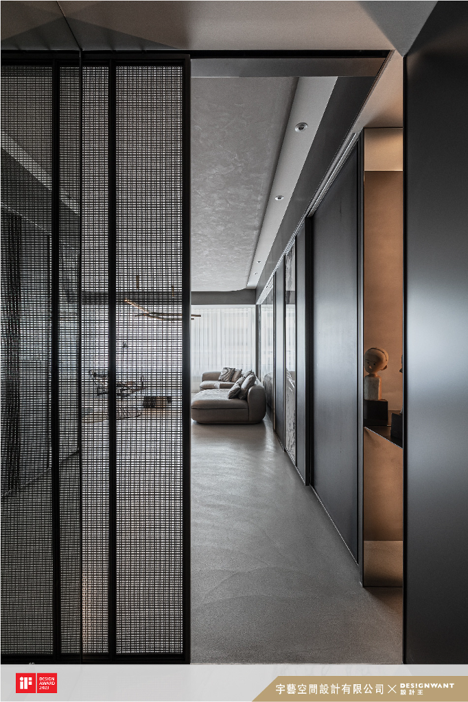 作品中多以特殊編織金屬網的滑門設計,區分場域與場域之間的界線,一般印象 中,立面是固定的,但是透過自動滑門讓立面賦予「可移動」的功能,它活絡立面的視覺、功能以及意義,無論是機能面、收納面以及空間支援面都與美感有共伴效應,重新界定空間的樣貌與意義。