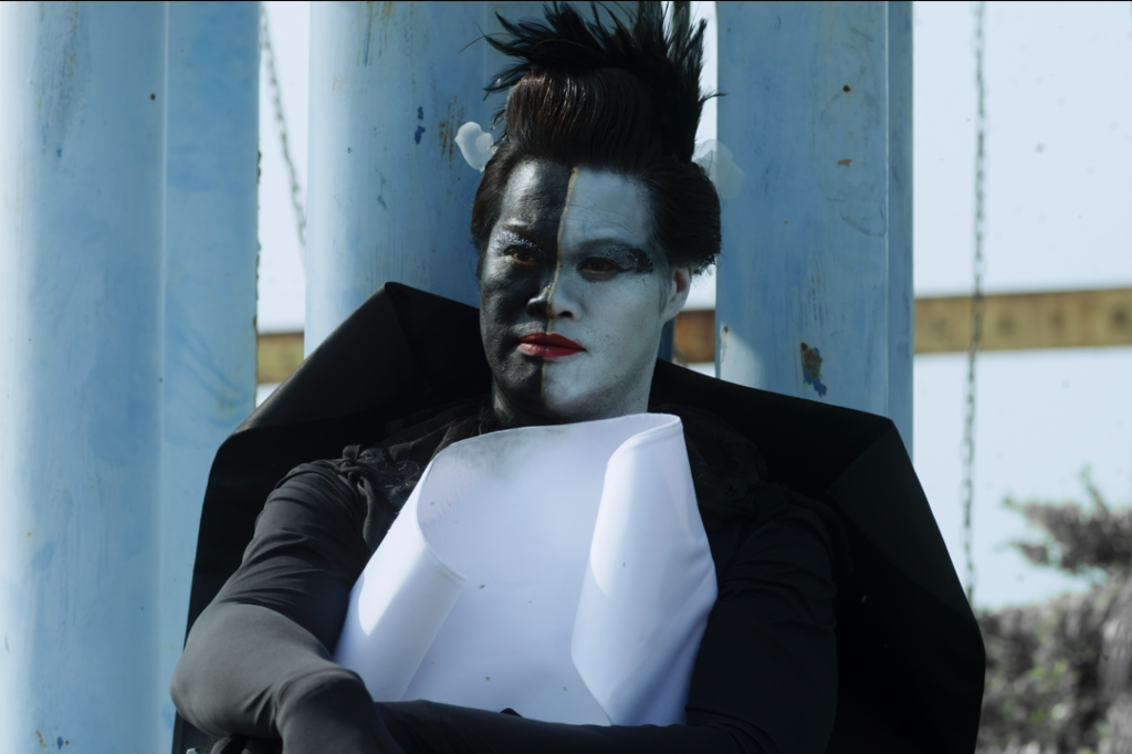 ▲ 九天民俗技藝團副團長瑪利亞(陳世旻)客串演出,「黑白臉」面容造型象徵善惡分明。(圖:風起娛樂)