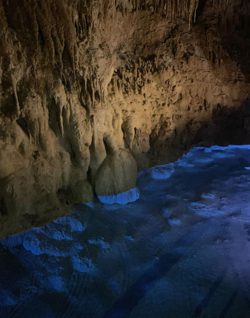 ▲ 沖繩洞內低窪處的積水透過彩色燈光打下,彷彿置身在奇幻世界裡。(圖:周子娛樂)
