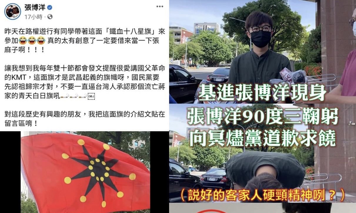 你要宣傳鐵血十八星旗,我是樂觀其成啦!這面旗幟也在中國歷史上留名青史,與北洋政府的五族共和旗、青天白日滿地紅的中華民國國旗、中華人民共和國的五星旗都一樣代表中國。不過,我只記得你張博洋向民進黨鞠躬道歉,大口吃著G邁餵養的狗糧。