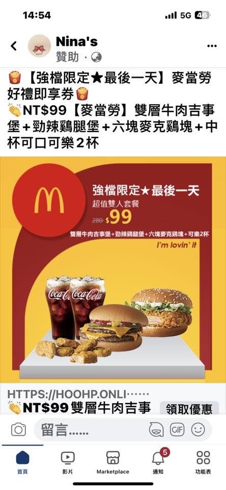 根據原PO貼出的照片可見,是在臉書粉專「Nina’s」的優惠廣告,超值雙人套餐「雙層牛肉吉士堡+勁辣雞腿堡+六塊麥克雞塊+中杯可口可樂2杯」只要99元,看似優惠,沒想到卻是詐騙資訊,被盜刷10萬元。