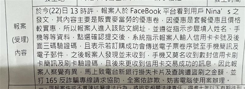 臉書詐騙層出不窮!近日一名網友在臉書滑到一則麥當勞優惠資訊,超值雙人套餐只要99元,讓她相當心動,沒想到下單後卻沒有收到可兌換的票券,而是在短短的4分鐘內,被盜刷10萬元。慘痛經驗曝光,釣出不少受害者。