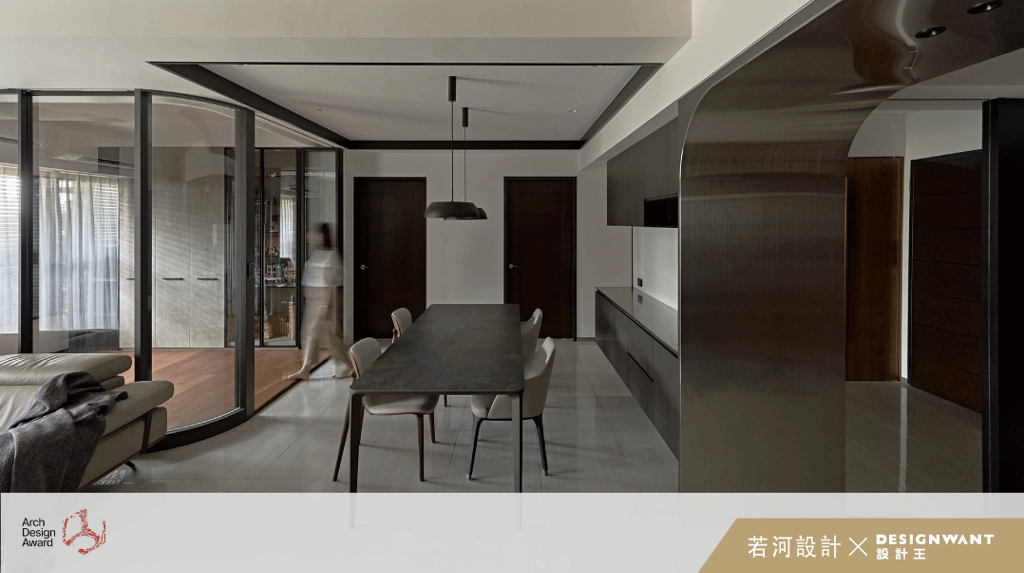 基地為新成屋,擁有270度高樓層的採光條件,本案取名為「弧光盛讚」,源自於業主對於居家環境的想像,設計端針對業主戶外運動嗜好,以及喜愛科技感的生活氛圍進行適度的格局調整與設計安排。作品中可以看見許多反射性材質,譬如金屬拱門、帶有光澤質地的立面、俐落的直線與優雅的弧線穿插其中等,將冷色調環境特有的內斂知性表露於全室,並將採光條件有效放大化,使日光的暖與室內的冷,達到和諧的平衡性。