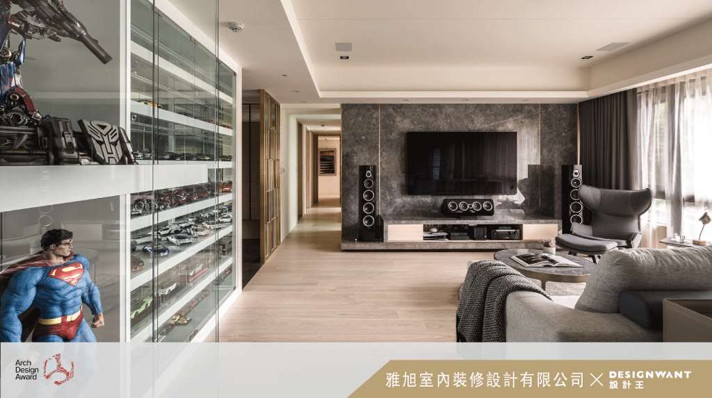 剛烈與輕奢,看似兩個互不相干的空間定調,在本次設計中一次呈現。如何將單身貴族的大量訂製收藏品擺放和未來二十年空間展望的構思一併考量,即是本次空間設計的要點之一。透過空間循序漸進的鋪陳將完善的機能所需與興趣愛好融合,既能滿足業主收藏品展示的需求,更同時為空間定調,達到機能美感兩不誤的目的。當中在陳列空間燈座光線的拿捏上下了許多心思,因此達到了每件收藏局部立體度呈現:此萬整體空間彩度在亮與暗的材質鋪敘下更調節出了獨有的場域層次,進而烘托起空間中貴氣輕奢與溫馨感並存的獨有氛圍。