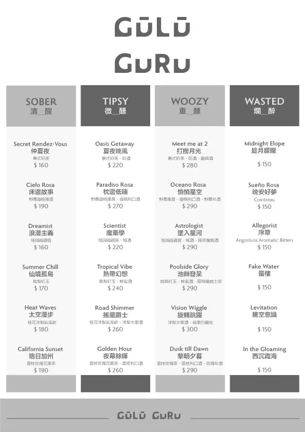 GŪLŪ GURU 酒調飲藉由六種原料,分成四種系列酒精濃度,分別有《清醒 Sober》、《微醺 Tipsy》、《重醺 Woozy》及《爛醉 Wasted》,共 24 款品項隨性任選。另外,也各自推出工藝版本,讓到訪的客人們能自由選擇喜歡的風味與酒感。