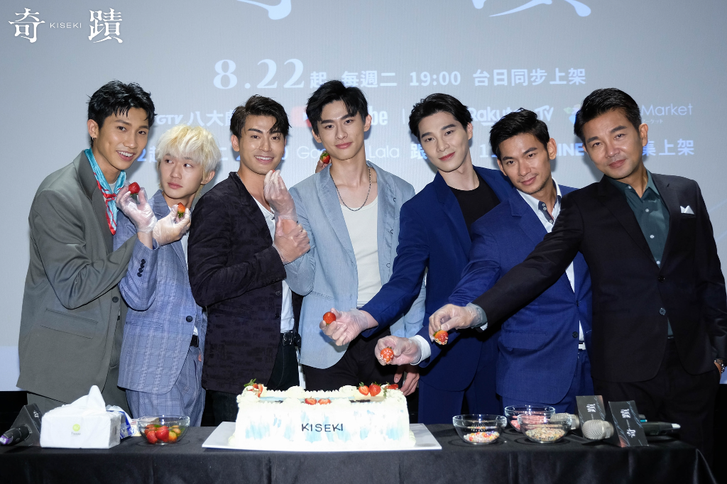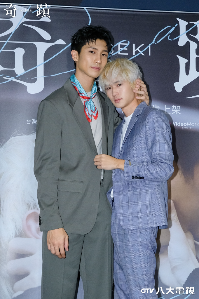 最新BL劇集《奇蹟》今(15日)舉辦首映記者會,演員徐愷、林毓桐、陳柏文、姜典、宋偉恩、謝承均、亮哲等盛裝出席。首映儀式中安排劇中主要CP徐愷、林毓桐「愛的連結」草莓蛋糕亮相,讓兩人陷入拍攝回憶,徐愷透露與林毓桐戲中最大尺度:「除了很多肌膚間的接觸,最大尺度到褲頭。」另一對CP姜典、陳柏文則回憶起親吻戲,陳柏文害羞表示:「很柔軟。」姜典則開玩笑說:「粗粗的。」