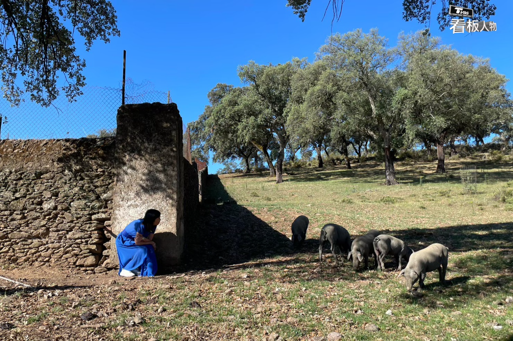 ▲ 走訪純種放養頂級伊比利豬的橡樹林,主持人方念華模仿叫聲流露出可愛一面。(圖/TVBS提供)。(圖:TVBS)