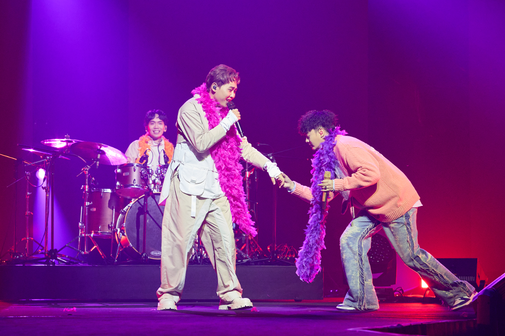 這次演唱會邀來的樂手陣容裡也藏著彩蛋!特別請icyball冰球樂團鼓手士捷擔任客座鼓手,介紹時全場響起熱烈尖叫,讓阿哲更開玩笑說:「把冰球最帥的請來了!」雞丁則對舞台上的圓弧燈柱設計特別介紹,表示這「大根」是象徵時間概念的穿梭,幽默說:「原本計畫想爬上去跟三樓的粉絲打招呼,當一隻「山道猴子」。」玩起時事梗逗樂全場。