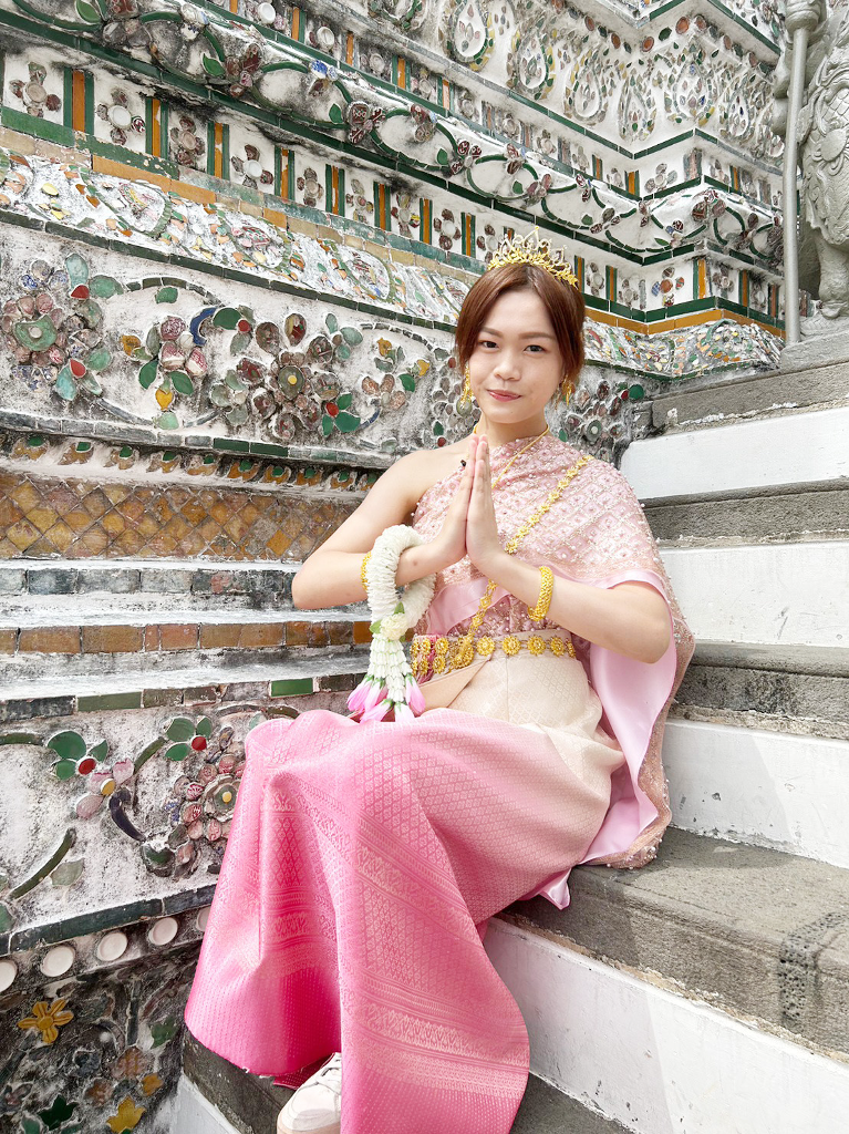 ▲大胃王小慧體驗泰國傳統服飾,於泰國曼谷「鄭王廟」拍攝。(圖:緯來綜合台)