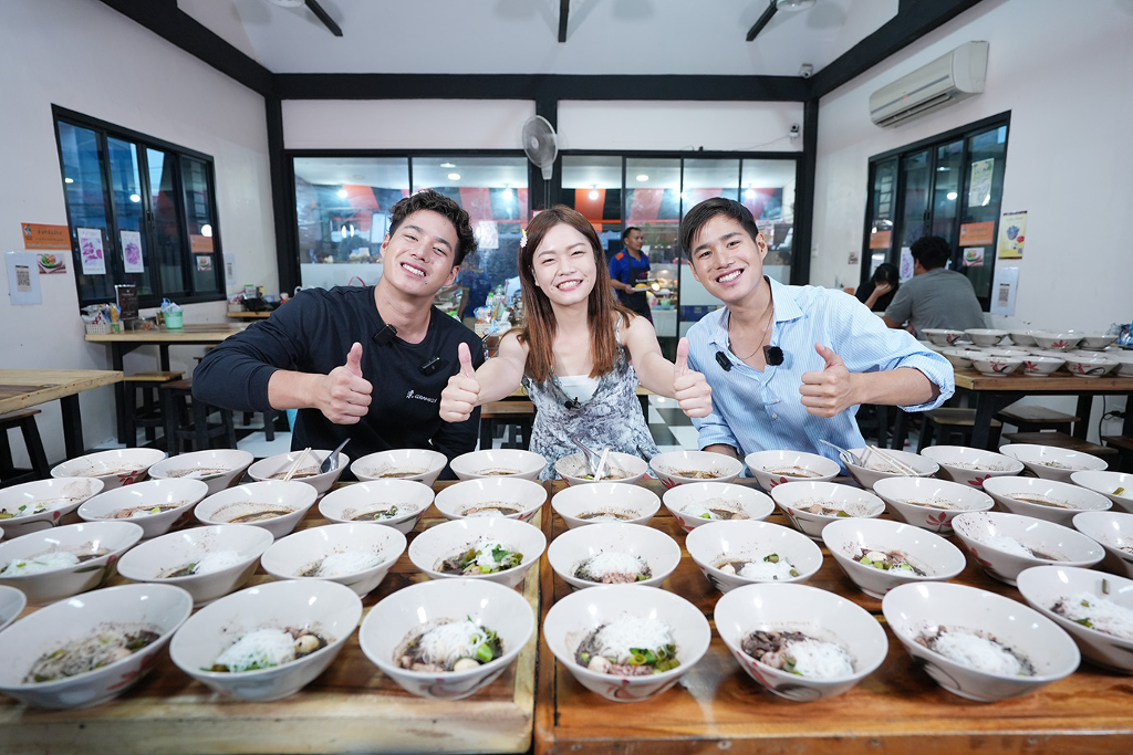 ▲ 小慧和泰國雙胞胎大胃王兄弟,一起挑戰船麵 (左)雙胞胎弟弟Pun (右)雙胞胎哥哥Pong。(圖:緯來綜合台)