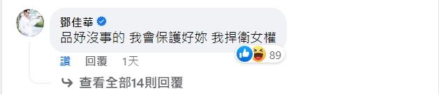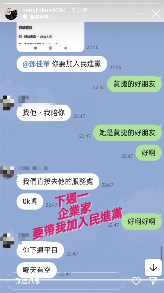 立委賴品妤24日出席記者會後不慎因碰撞跌倒,並與媒體發生衝突,場面一度陷入混亂引發關注。賴品妤事後透過臉書發文指稱,該名記者爭議不斷,「故意在無關場合製造混亂,好讓自己做想要的新聞操作,這樣的行為已不配稱為記者」。貼文曝光後,釣出一排綠營政治人物帳號力挺,其中也驚見網紅鄧佳華心疼表示:「品妤沒事的,我會保護好妳,我捍衛女權。」鄧佳華今天也社群限動貼出與好友的Line私訊截圖,對方邀請他加入民進黨,並表示願意陪他去服務處,鄧佳華看到對方疑似是黃捷的好友,立刻鬆口答應:「好啊好啊。」鄧佳華最後也上大字幕寫道:「下周一,企業家要帶我加入民進黨。」
