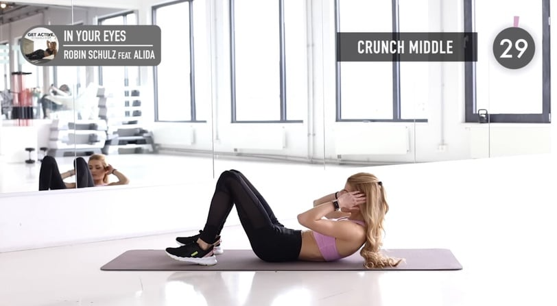 第一步動作就是大家熟知的「仰臥起坐」,需做三十秒。要注意做仰臥起坐時不需整個上身90度坐起,離開地面大概45度就好,速度也並不是越快越好,將注意力集中在上腹部施力,並配合呼吸慢慢來。姿勢正確才不會造成頸部和背部的傷害唷!