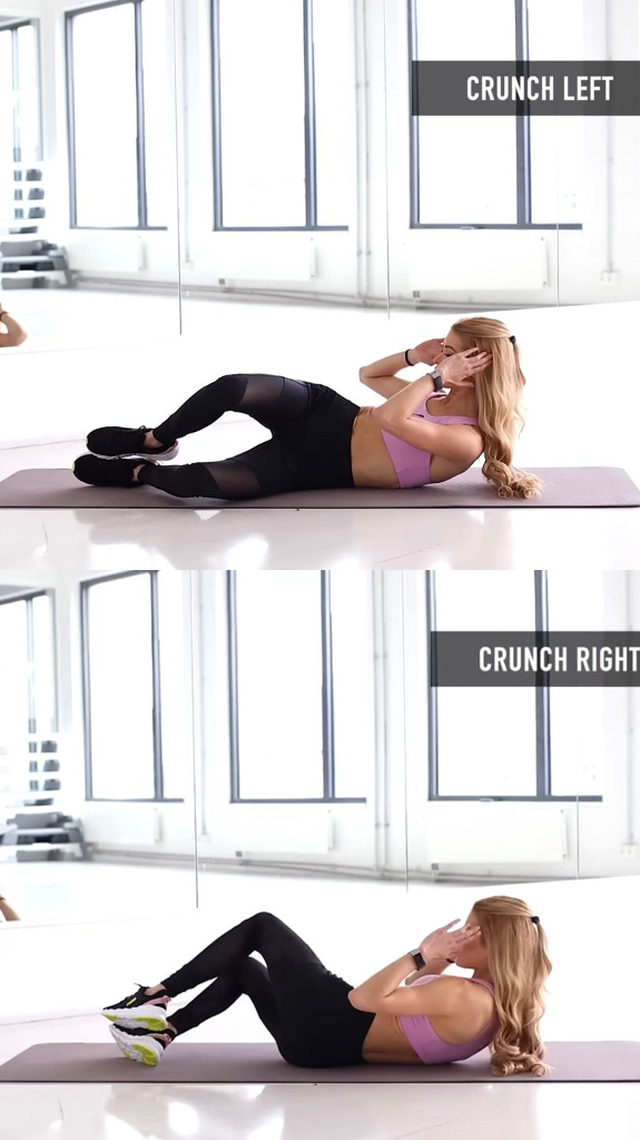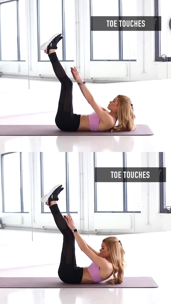 將雙腳抬高,身體向仰臥起坐一樣起來觸碰到小腿,這動作並不用碰到腳趾,只是訓練核心的同時保持腿向上伸直,能更加強效果。注意也不要將身體全平躺在地,然後再起來,保持著離地的高度才不會讓背部受傷,做30秒後休息10秒鐘。