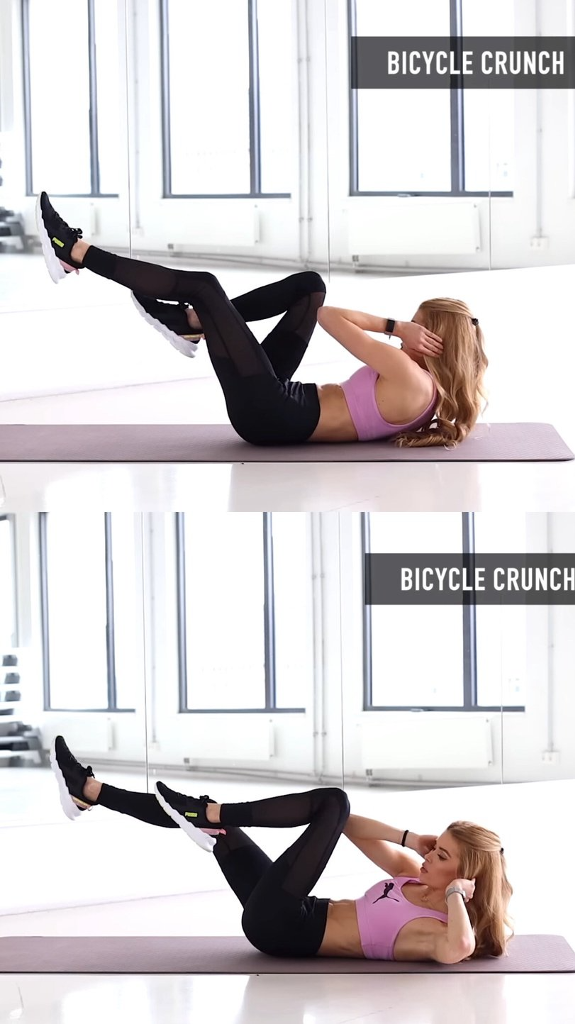 大家熟悉的空中腳踏車動作,不僅可以練肚子還能瘦腿,注意動作不要太快!將左手臂碰右膝、右手臂碰左膝,身體要保持不要平躺到地上唷,慢慢做30秒後休息10秒鐘。