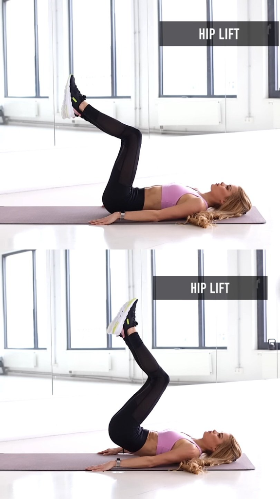 慢慢地利用肚子的力量,穩定地將腿和臀部往上頂,上半身可以貼地,雙腿彎曲不用伸直,記住一定不要太快,會傷害到脊椎和背部。動作持續30秒休息10秒鐘!
