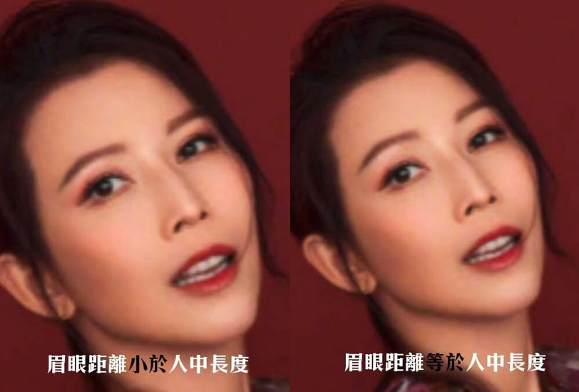 《浪姐4》成員之一的蔡少芬便是標準的長人中,因此可以看見,當眉眼間距小於人中長度時,整個人看起來會稍微再有氣勢一點,反之則看起來相對柔和。