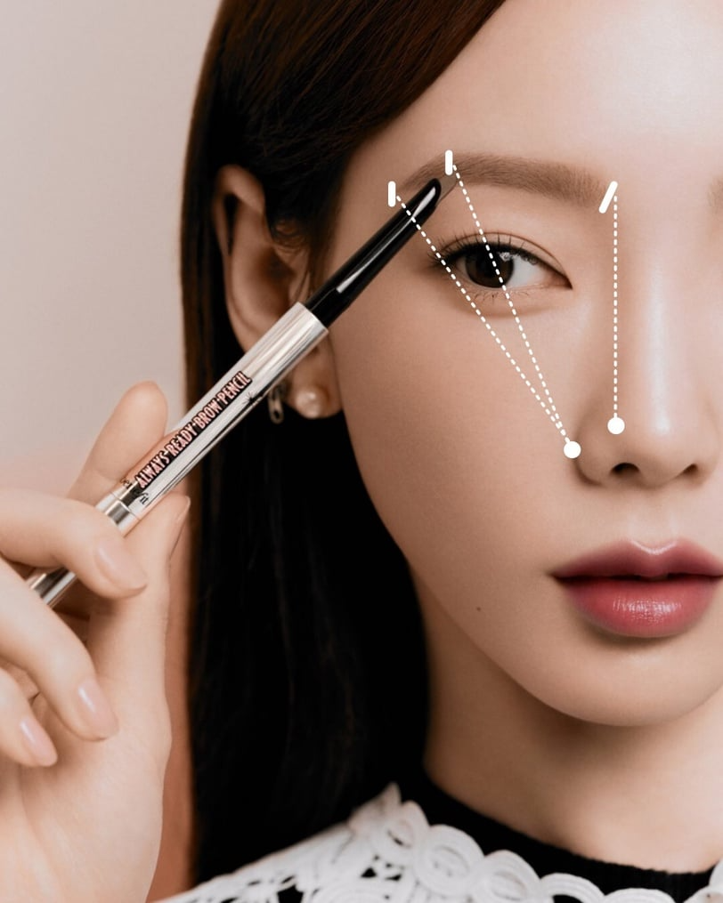 除了眉尾的長度,眉毛整體的長度也跟「眉頭起點」有關,眼距較寬的人,需要將眼頭往前畫一點、甚至可在山根位置上陰影;反之,則可透過將眼頭顏色刷淡方式來處理,就能讓眼距在視覺上舒展開來。