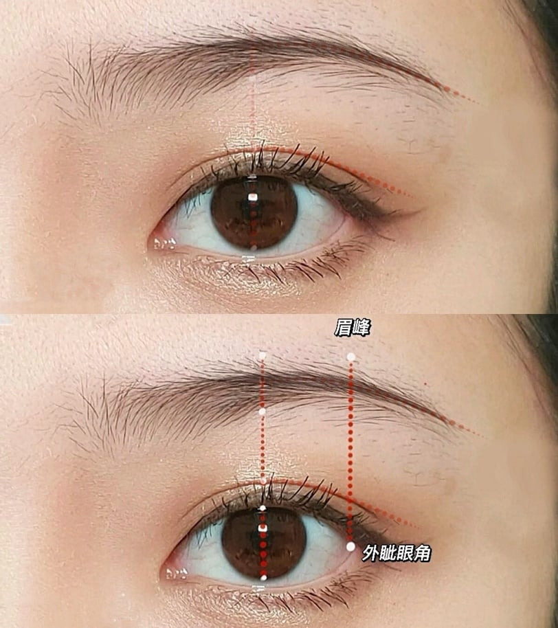 此外,若臉型較為偏圓、稜角感不明顯,則更適合眉峰不明顯或無眉峰的眉型;反之,臉的稜角感明顯、五官立體,就非常適合有眉峰的眉型!而「眉峰」基本都在瞳孔外側到外眥眼角的區間,垂直正上方就是眉峰的位置。