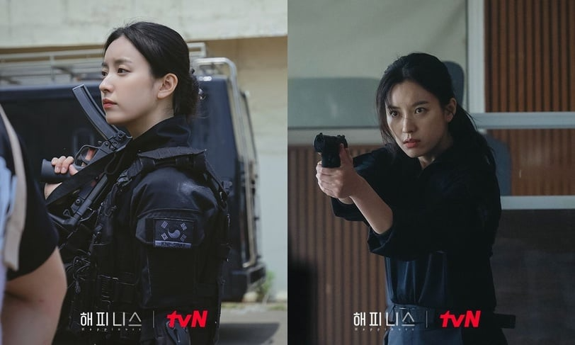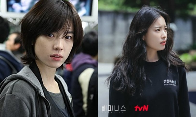 《監諜任務》是韓孝周首次挑戰的動作片,劇中飾演的是刑警角色,剪去長髮,換上俐落的微中性短髮,搭配瀏海造型不僅不違和,反而有種小男孩感的減齡效果!對比《Happiness》同樣飾演警察角色的中分微捲髮、蓬鬆髮量,更顯得成熟有女人味!