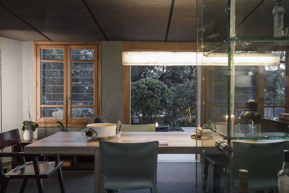 利用同樣功能和相同特性的重複疊合,「雙子座之屋」的所有區域顛覆了住宅功能性的傳統規範;用餐區的風格與位置與廚房毫無任何關聯,臥房距離浴室門口也相當遙遠,大門寬敞到根本不像住宅正門,然而這些與普世定律相衝突的元素,卻散發出新的創造力;原先的餐廳在增加範圍後成為瑜珈室。空間中央可隨時啟閉的日式超薄滑門將內部一分為二,不僅相當具有彈性的調整不同使用性質的場地,視覺上更變化出多樣性。以黑為主色調的小孩房則兼具表演空間,當姪子或友人前來可充當為他們的客房。原來作為辦公室大門使用的出口被改造為對外窗,並以室外庭園為背景。大部分以木紋板為主客製出的門、框與家具,一同搭配著地毯、大幅油畫與佛像,以東西方交融的風格激盪出非典型的日式侘寂風格。