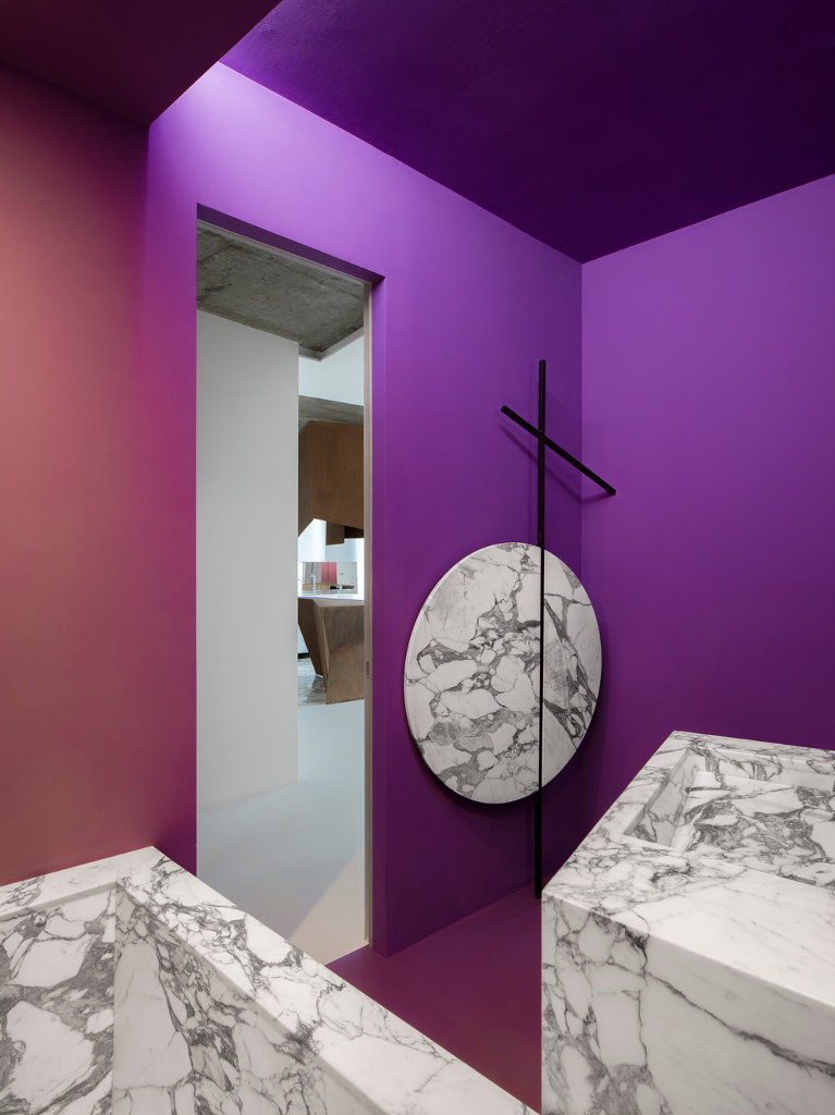 受到俄羅斯前衛藝術的啟發,「Golden Mile」除了以白色噢至上主義繪畫精神揮灑出空間主要調性外,整個室內改造還利用了龐大的雕塑概念,強調出家具家飾在功能之外的精采度;白色塗料配合未經處理的裸露天花,走廊左拐進入浴室後卻又是紫羅蘭色的豔麗景象,設計公司Maxim Kashin Architects大量利用正方形與圓形、直線、十字形讓空間維度變得更具戲劇性。設計端借用了俄羅斯至上主義藝術創始者Kazemir Malevich的作品《黑方塊》、《Supremus № 56》、《白色十字架》所啟發出的概念進行裝飾。利用三維度雕塑形式,Maxim Kashin Architects成功以20世紀最前衛的美學概念,讓業主的家變得更加不可思議。