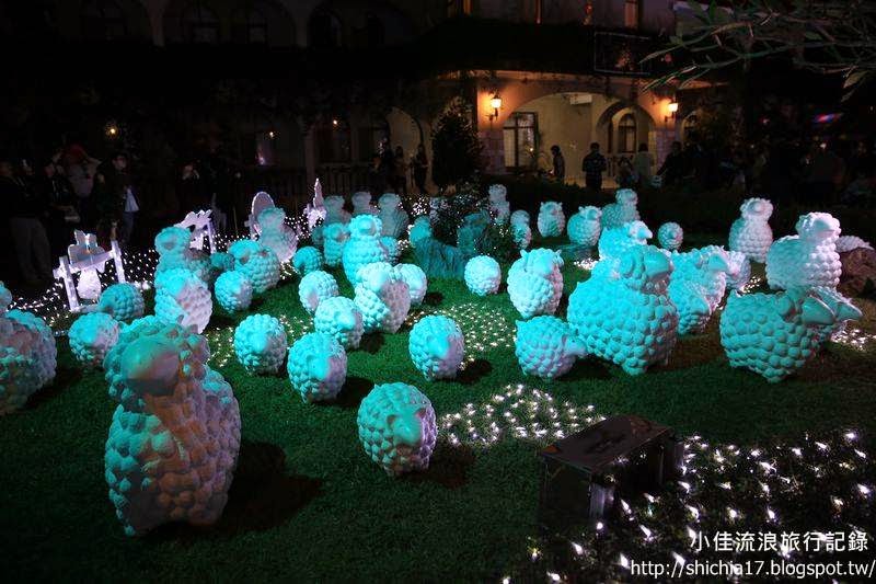 廣場左側的羊群也是今年一大亮點,純白的羊咩咩成群站著就是萌阿!!配上LED燈光和旁邊聖誕樹顏色的變化,會有不同顏色,很可愛!