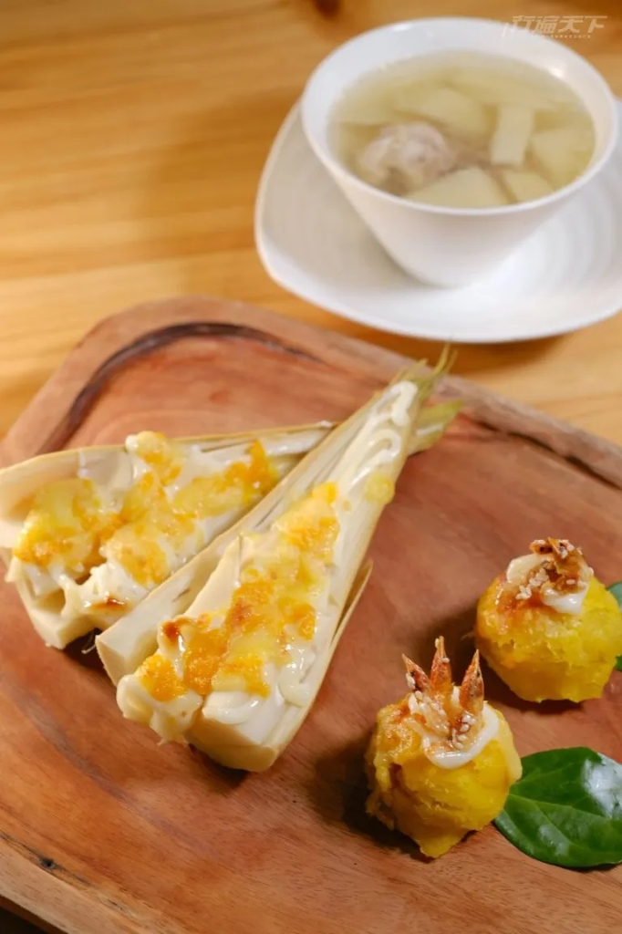 許多人會專程開車來吃飯,因為農場餐廳所使用都是自家栽種的最新鮮、最健康的食材,最受歡迎的是以當地盛產竹筍所製作的各種料理,炒鮮筍、焗烤綠竹筍、筍子雞湯、麻竹筍野菜粥……等應有盡有,提前預約的話,還可以吃到炭烤蘭嶼種迷你豬。園區還修築了登山步道,走一圈大概一個小時。如果想深度體驗,不妨住一晚,無論小木屋或是歐式別墅都可以住在森林裡。
