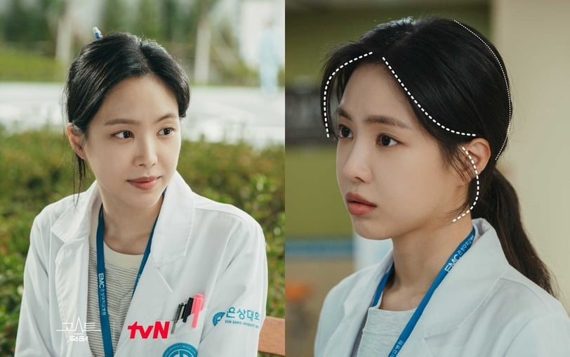 孫娜恩在《Ghost Doctor》飾演急診室實習醫生「吳秀晶」,因為角色關係、劇中多半是直髮搭配綁髮造型,但是仔細注意小細節,娜恩的碎髮可以說是關鍵!在綁髮時注意後腦勺拉出圓弧感,搭配耳際的碎髮,其實可以最大限度的修飾臉型缺點,讓臉型線條更加飽滿。