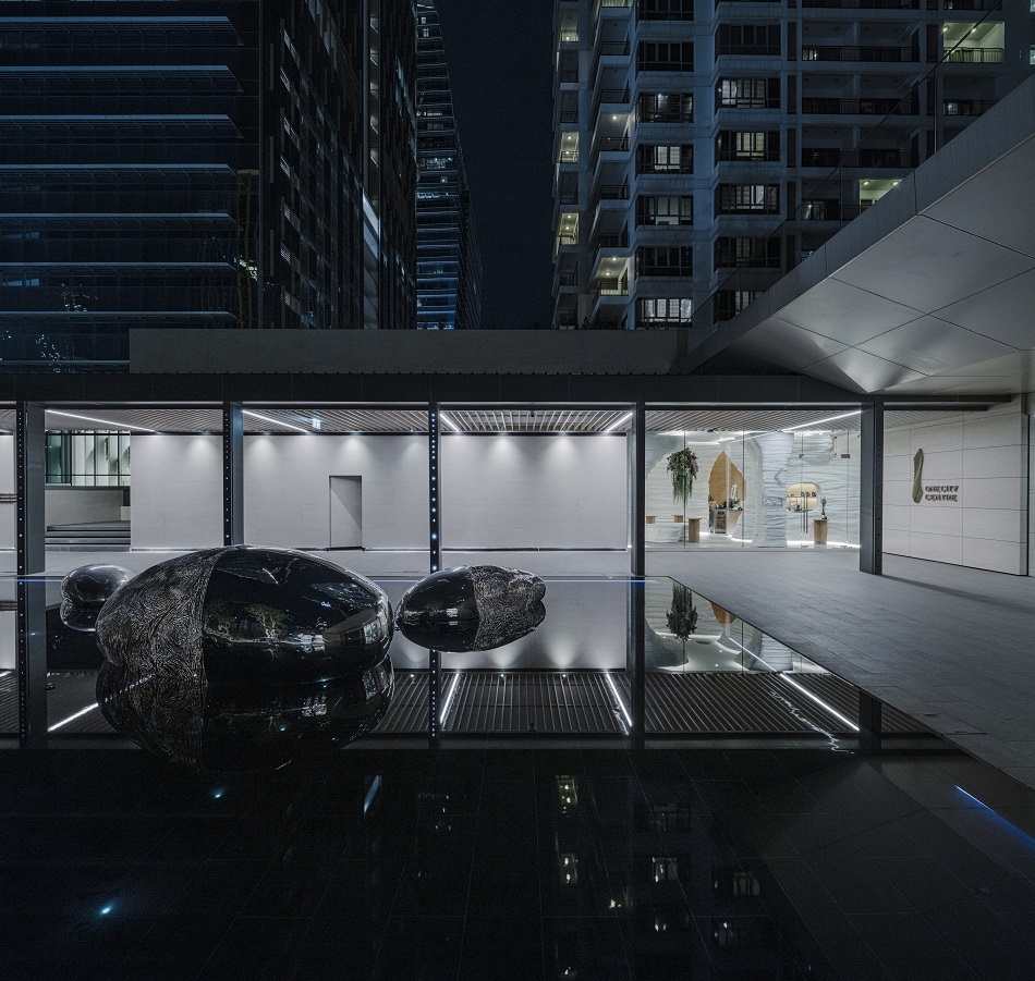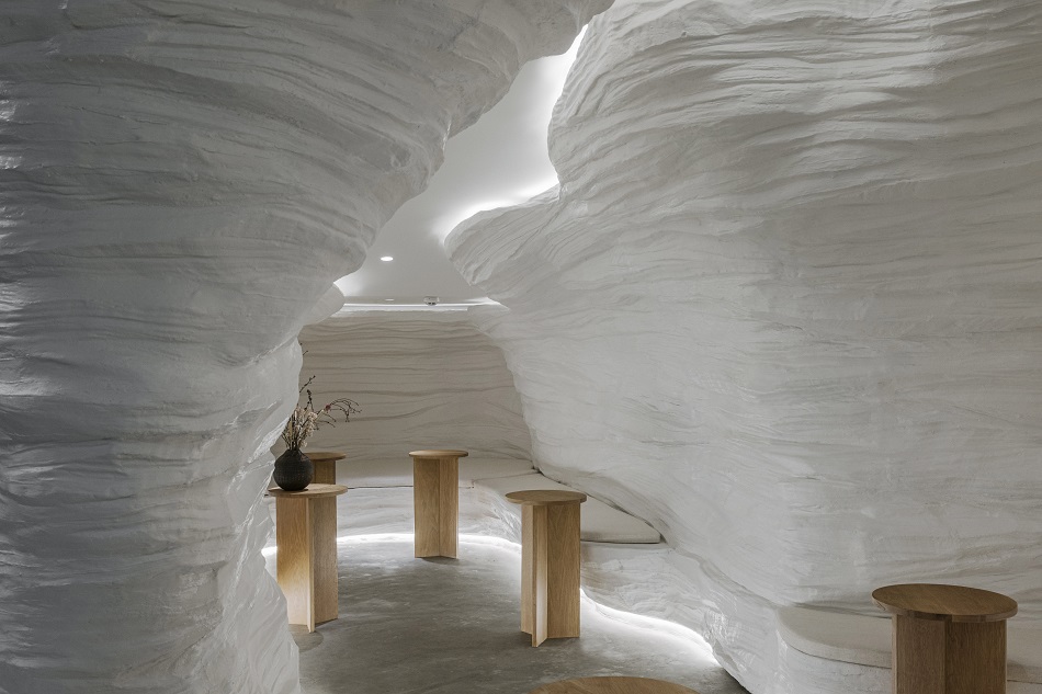 由於是品牌第一家門市,更是旗艦店,在你進入大門之前JUTI Arhchitects便在廣場旁階梯下方區域為品牌打造一個專屬的形象平台;店門口前的大範圍水池將四周高樓的倒影包含在內,就如同包圍著岩洞入口的混凝土丘陵。享有全景視野的落地窗內可清晰看到飲料店接近白色鐘乳石洞的室內場景,而這些視覺感逼近岩石的材料全採用玻璃纖維,並利用CNC雕刻機切割而成,這樣的壁面裝飾全由Art of Tea公司代工製作;以全橡木材質施作而成的櫃檯、櫥櫃和圓形吧檯桌,十分適合搭配店內使用的黑岩柴燒茶杯與點心餐盤,就連上方懸掛的揚聲器也委託日本知名花店Ganon Florist運用極具藝術性的插花技巧加以裝飾。
