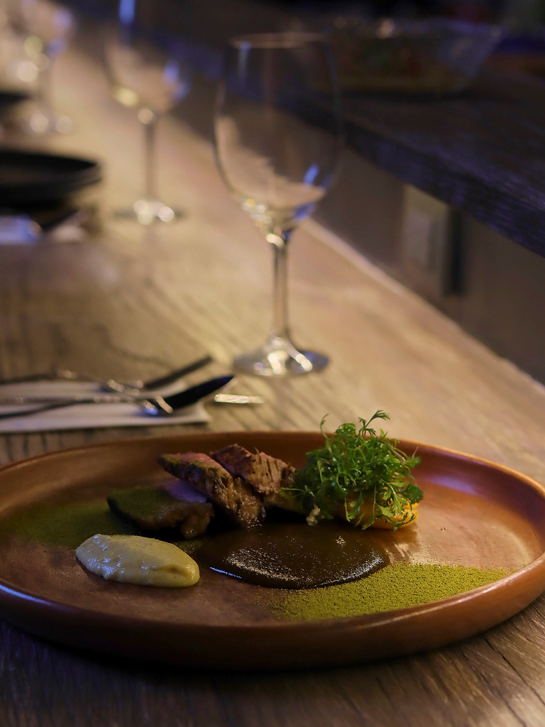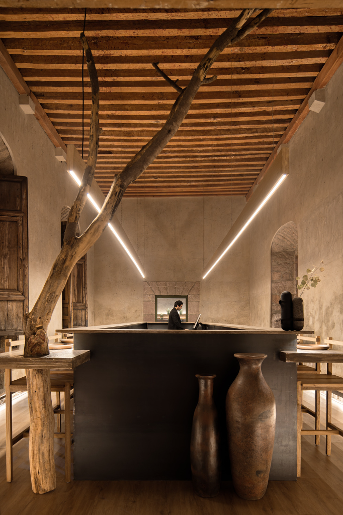 透過室內設計,該設計案透過過去建築的甦醒,一同影響著其內擺設的家具、裝飾與運用的材料,透過適度的搭配傳達現代主義的精髓,營造出一種內斂、優雅、清新的氛圍。吧檯的概念進一步讓職人準備的食材和各式菜色更容易被發現,沿著地面邊緣延伸的間接照明則放亮了既有的古樸石灰岩牆面,這樣的照明方式讓歷經兩百年的歷史層次進一步放大,並且更容易彰顯其建築價值。