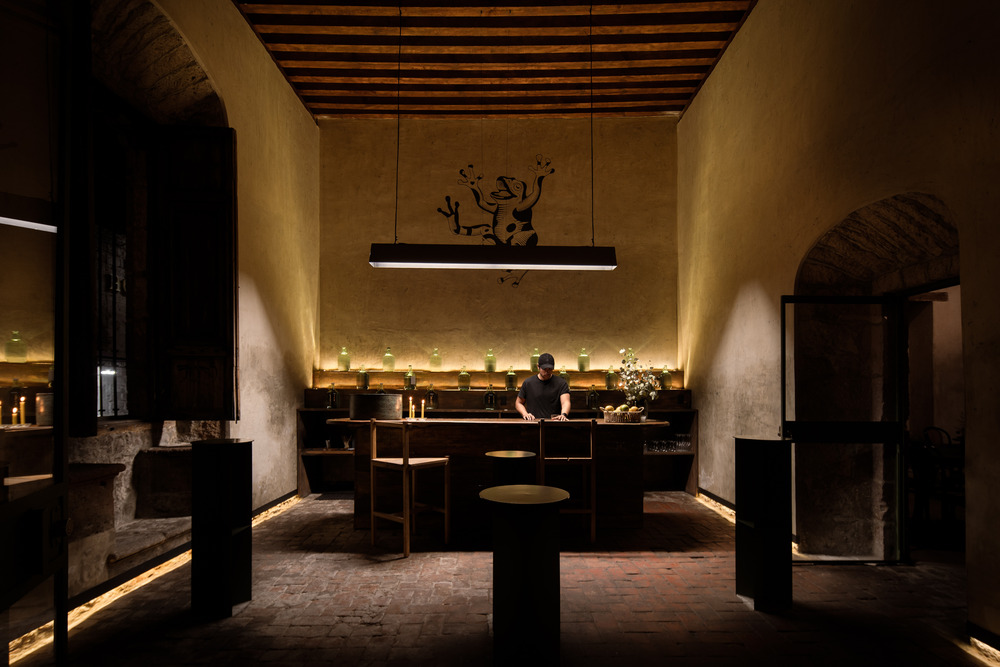 室內佈局包含了兩個與庭院相連結的房間,兩側是巴洛克風格的建築元素。最大的主空間設有長條形吧檯,配有20張高腳椅,而第二間同樣附帶酒吧的房間則在另一側以更深沉的光影變化引誘你入內。當人們進入餐廳時,室內環境由巨大石牆包圍著,令人印象深刻的長吧檯更適合顧客聚集在廚師面前,欣賞著他為客人為料理盛宴所做的一切準備。