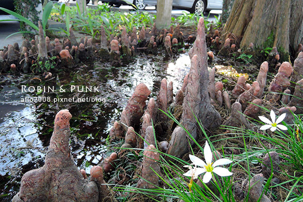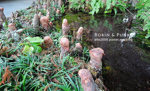 原來這是落羽松的[膝根],由於土壤的含氧量少,所以落羽松會從地底下竄出大大小小的膝根來呼吸新鮮空氣,形成了特殊的景色