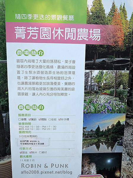 餐廳門口有立牌介紹園區的特色及營業時間,不過看立牌上的服務項目有”住宿、導覽”這二個沒有打勾,也許是日後會提供!?