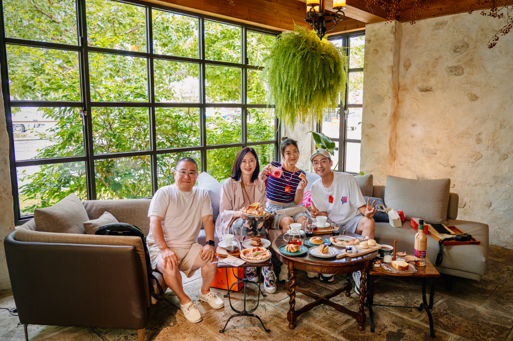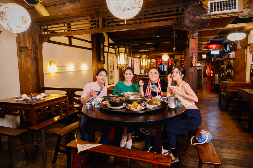 ▲ 《花甲少年趣旅行》桃園行全員品嚐客家料理。(圖:東森)