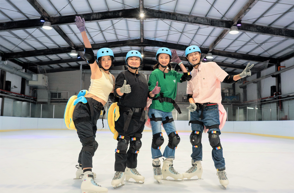 ▲ 東森綜合《花甲少年趣旅行》全員挑戰冰刀溜冰(由左至右)大霈(李霈瑜)、張永正、李之勤、大鶴(林鶴軒)。(圖:東森)
