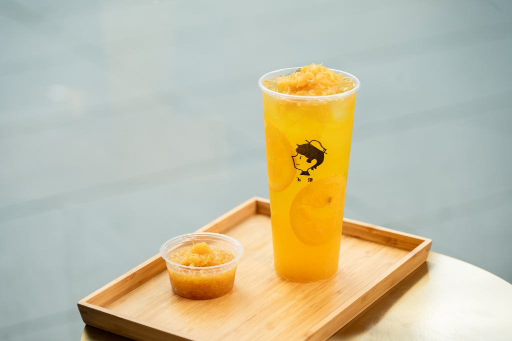「滿杯橙橙」以茉莉綠茶為基底,加上新鮮柳橙果粒,咀嚼感大大升級。新鮮果片點綴更是畫龍點睛,完美呈現「滿杯」之名。