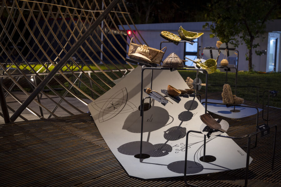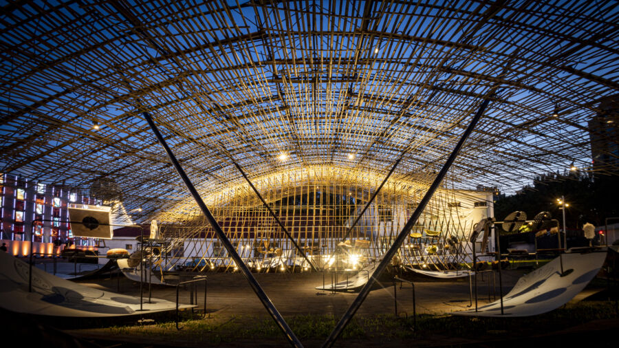 (藝術中心/綜合報導)今年臺灣文博會出現一件空靈侘寂風的戶外工藝展館,由國立臺灣工藝研究發展中心策劃運用竹材、鋼筋兩樣原始的材料,創造具有飄浮設計感的工藝裝置,由林聖峰建築師與徐暋盛工藝師共同合創,以「鷂-飄浮的停機坪」為命名,挑戰戶外道法自然,風、雨、陽光灑落,探討工藝結合生存、生活、生命三生之哲理。